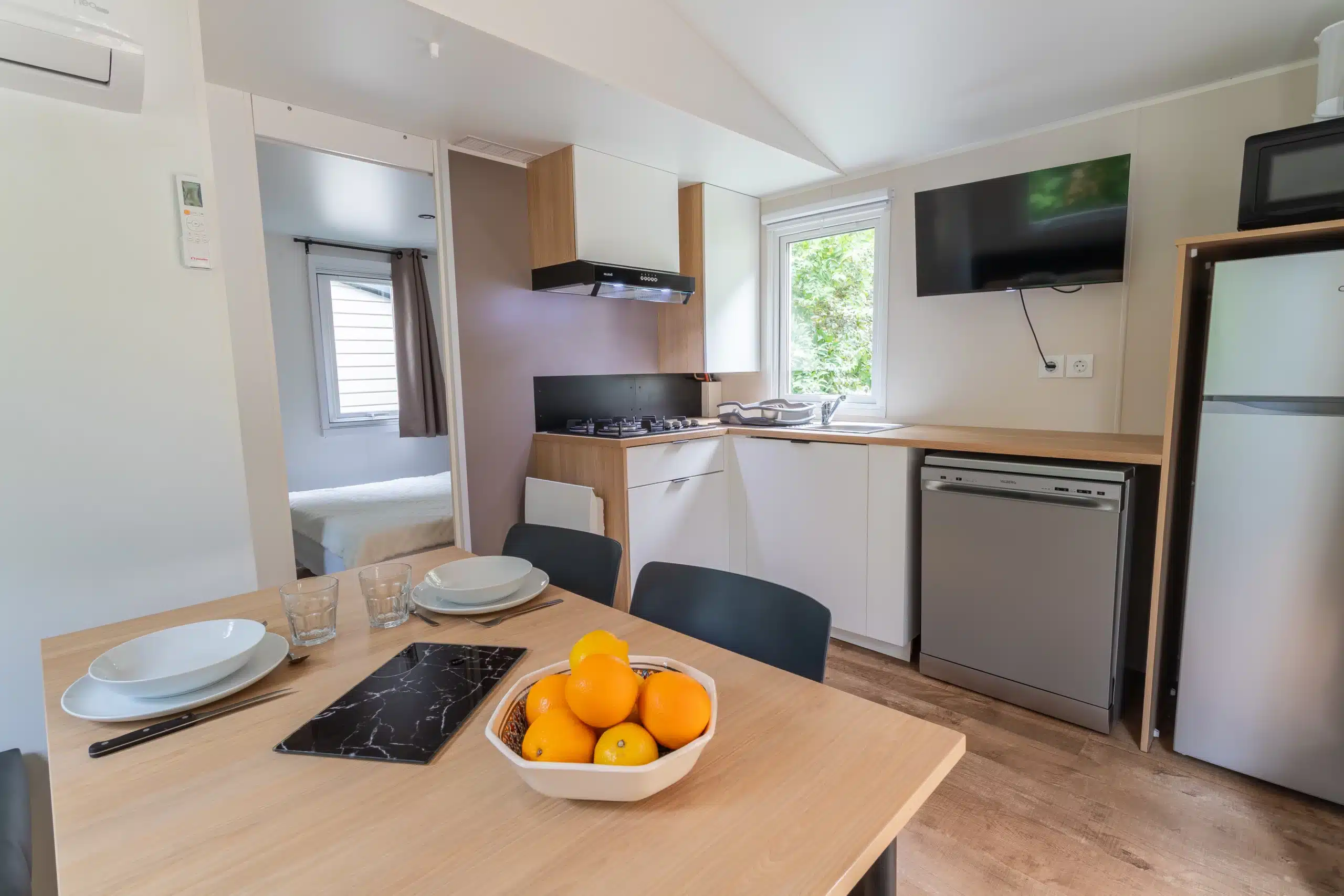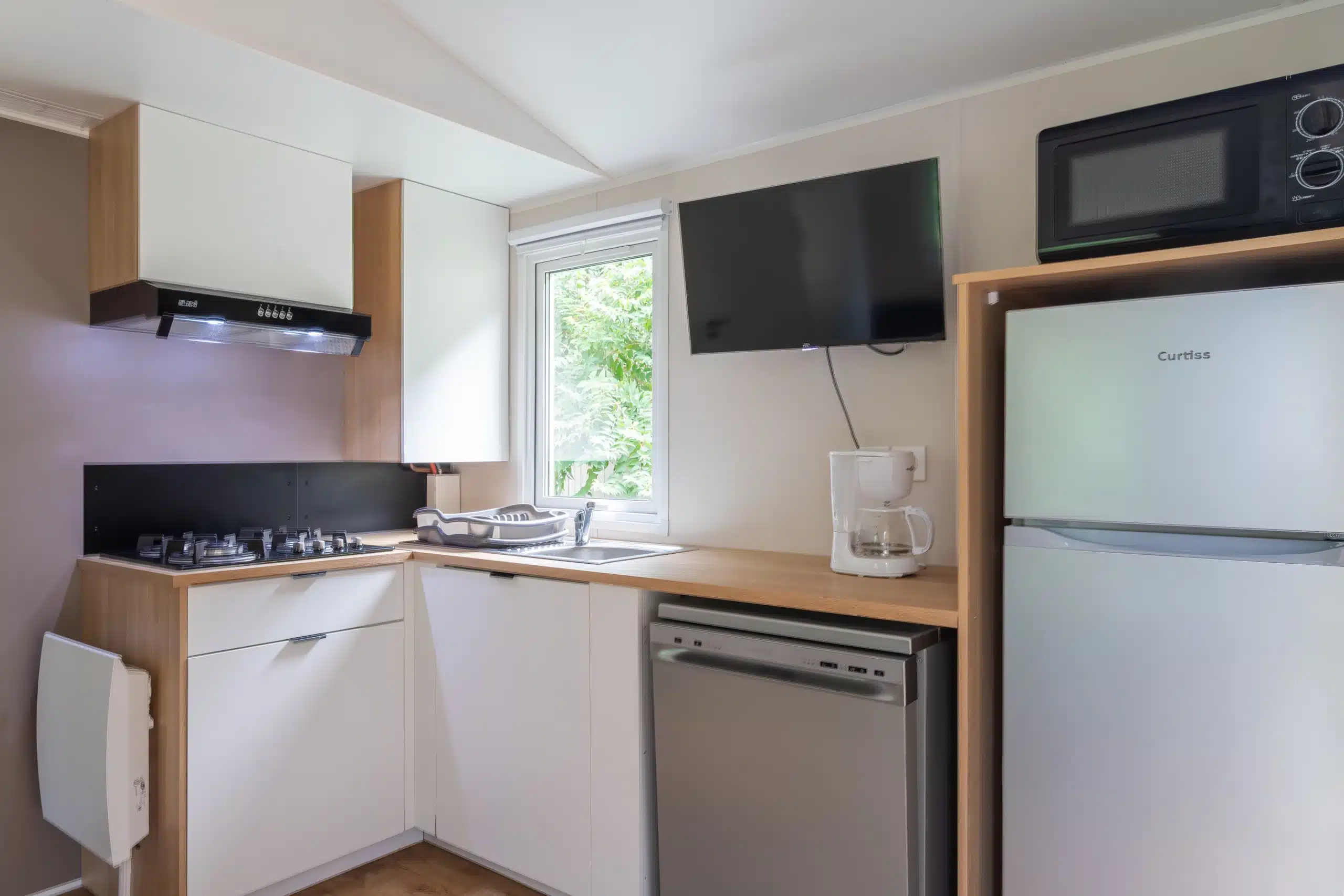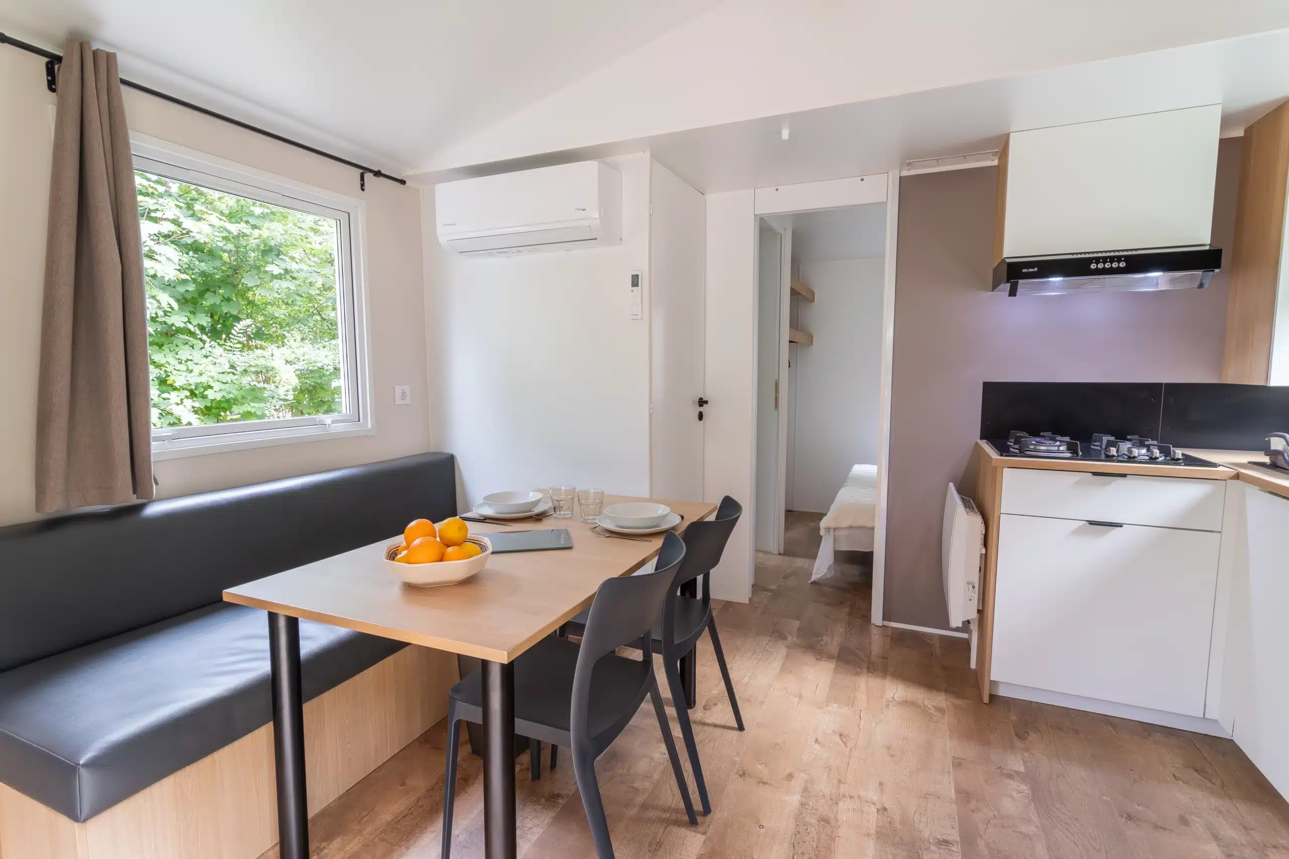 This compact 20 m² cottage is perfect for a couple or small family. With its bedroom equipped with a 140 cm bed, optimized living space and essential equipment, it guarantees a comfortable stay with ease.