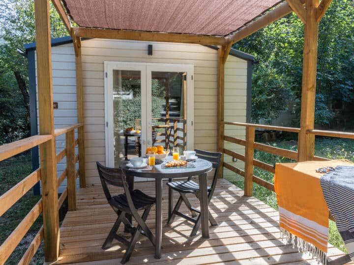 Sa terrasse extérieure vous invite à partager des moments agréables autour d’un repas ou d’un apéritif en plein air, tout en profitant du cadre naturel et reposant du Camping Maïana.
